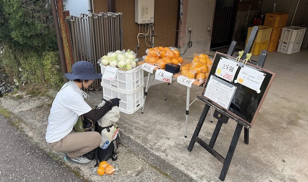 そんな石畳の道中、民家の軒先にぽつんと置かれた無人販売所。 そこで出会ったのが、地元の特産「三宝柑(さんぽうかん)」(200円)です。