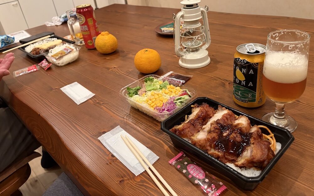 ひたすら黙々と歩き、途中のローソンでチキン弁当と「よなよなエール」を調達。